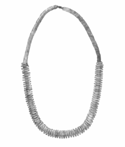 “I like your necklace. Even if you hide it, I find it delicate. I have never seen this white texture. It makes me think of bones, but the white is stronger. I wonder what it is made of.”